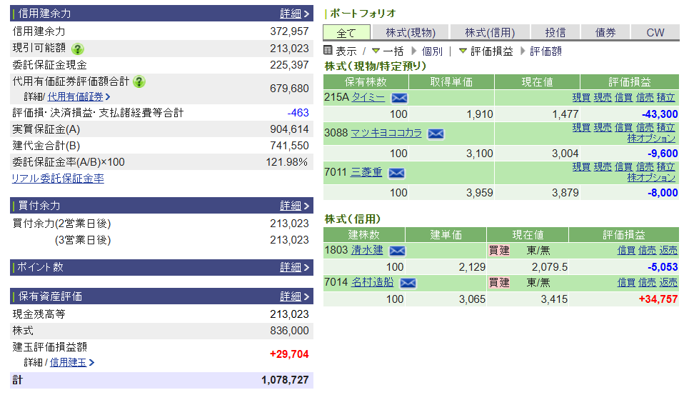 資産運用結果296:2025-09-30(日経-111円) 2025.09.30これまでの投資結果損切り日経平均:45,054円 → 44,932円(前日比-111円:-0.2%)今日の取引内容今日も日経平均は下がって3日続落。硬かった45,000円も割れてしまいました。「川崎汽船(9107)」が200日の移動平均線を割ってしまったので損切り。このまましばらく調整期間突入なのかなー今日の売買履歴【売却】川崎汽船(9107)100株 [損切り]今日の資産残高現在資産1,078,727円当初資産1,000,000円評価損益-31,196円評価損益率-2.81%