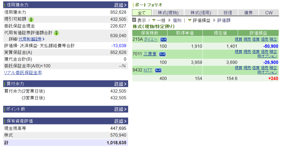 資産運用結果299:2025-10-03(日経+832円) 2025.10.03これまでの投資結果購入日経平均:45,042円 → 45,769円(前日比+832円:+1.9%)今日の取引内容昨日いろいろ損切りして今日は大人しくしておこうと思った日に限って全部上へ。。。もうヤダー今日の売買履歴【購入】NTT(9432)200株今日の資産残高現在資産1,018,635円当初資産1,000,000円評価損益-77,560円評価損益率-7.07%