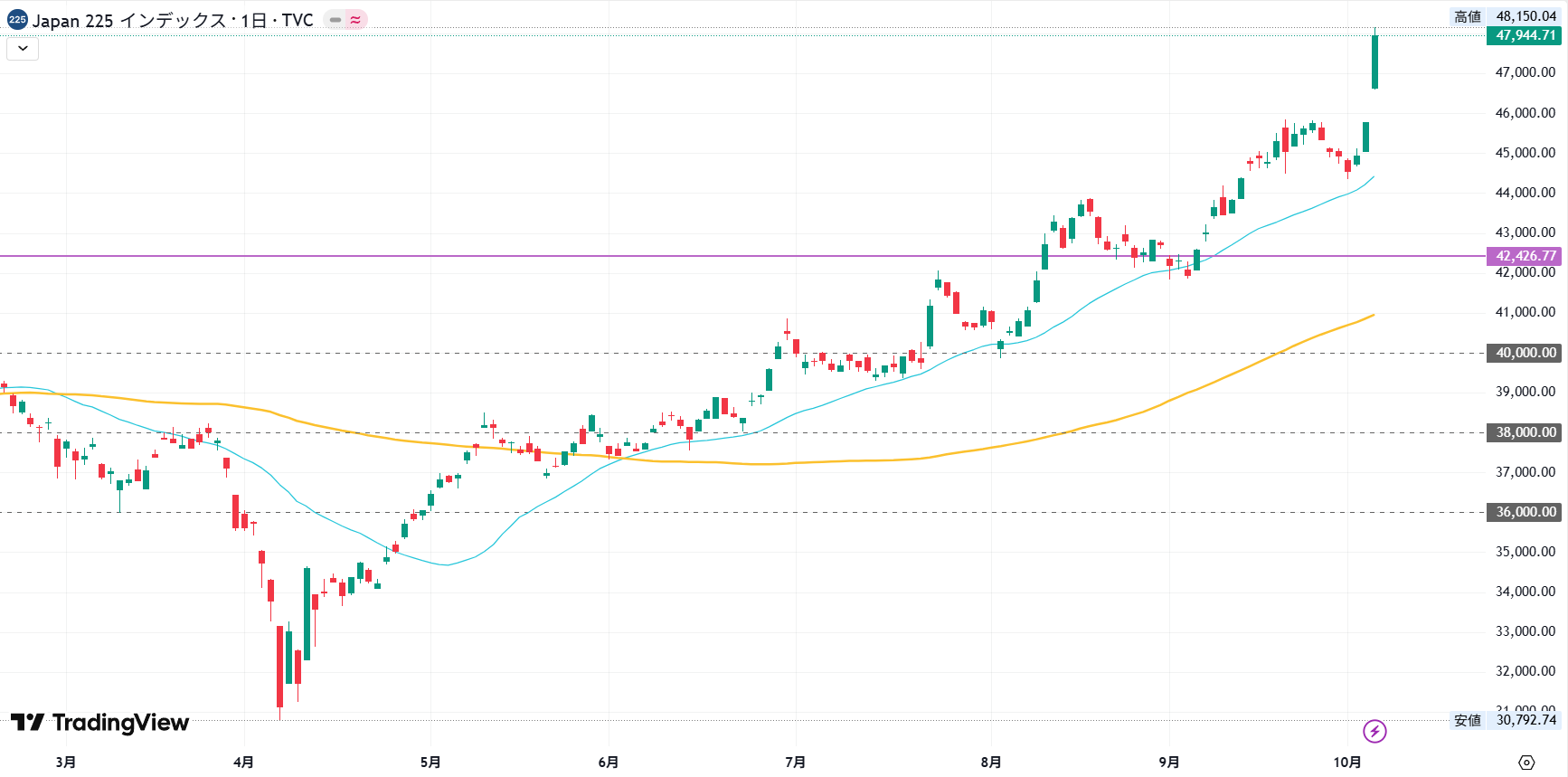 先週末の自民党総裁選で高市早苗さんが当選されたことで、朝から日経平均が1,000円近くも大幅ギャップアップしてスタート。
