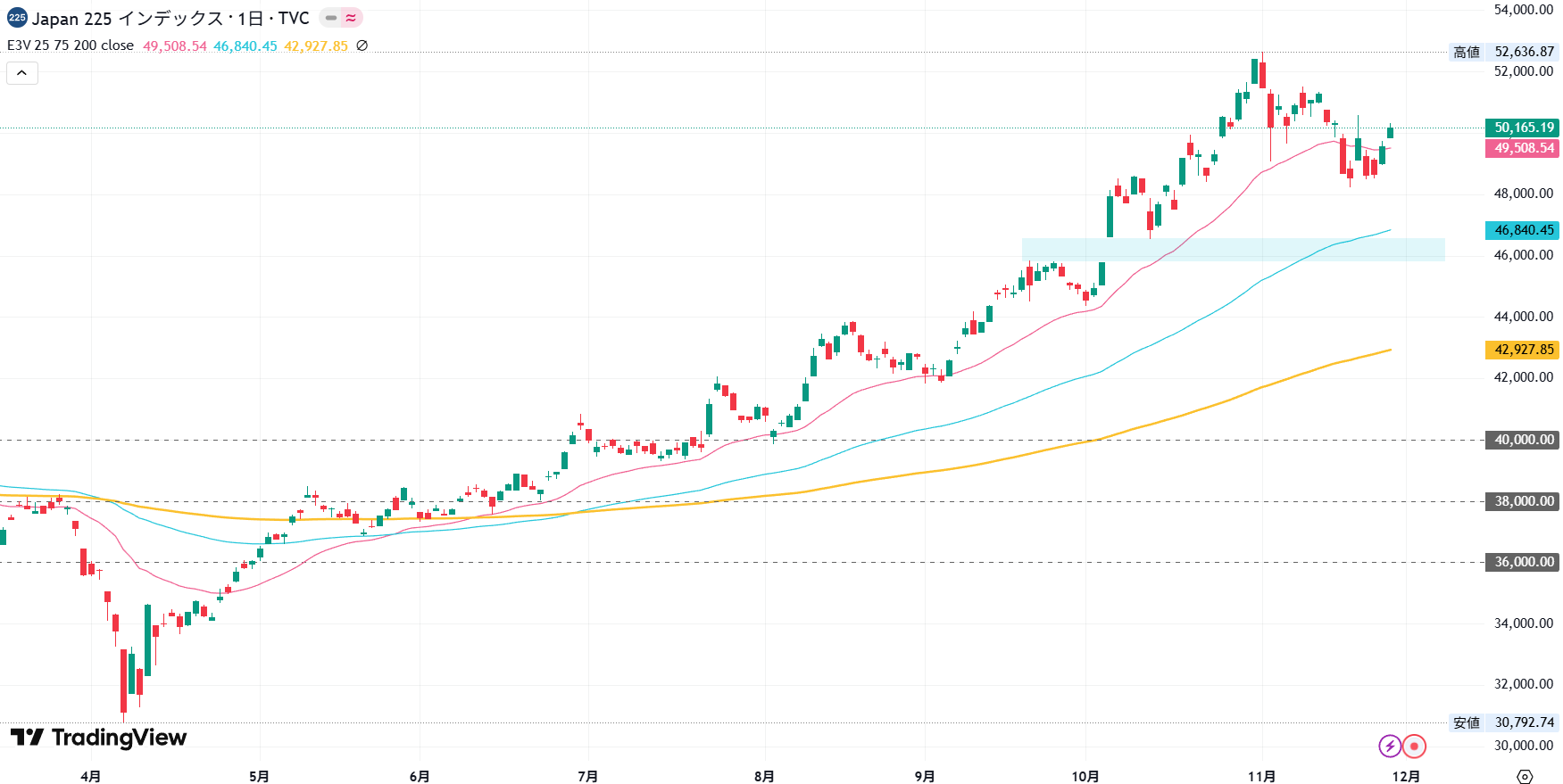 日経平均:49,868円 → 50,167円(前日比+608円:+1.2%)
