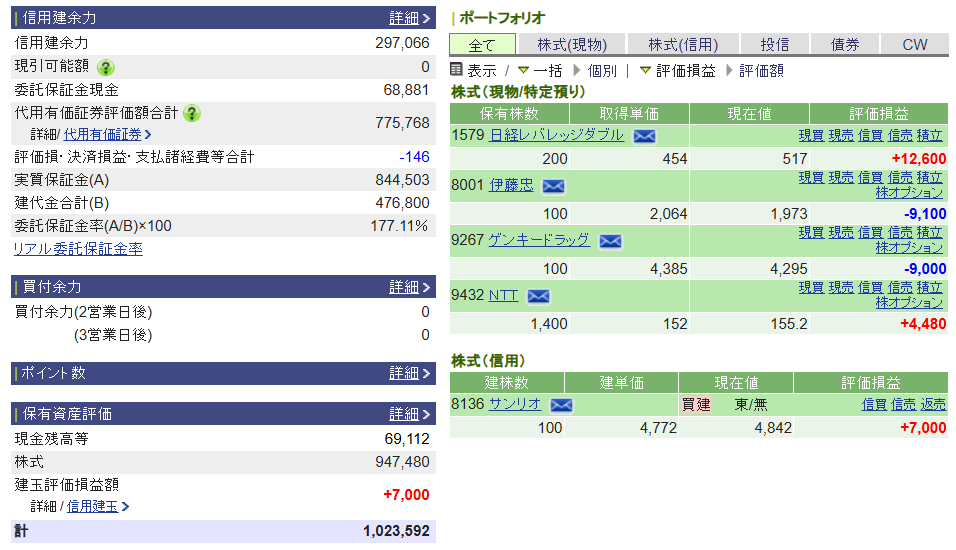 先週までは大きな含み益だった「ゲンキードラッグ(9267)」があっという間にマイ転。