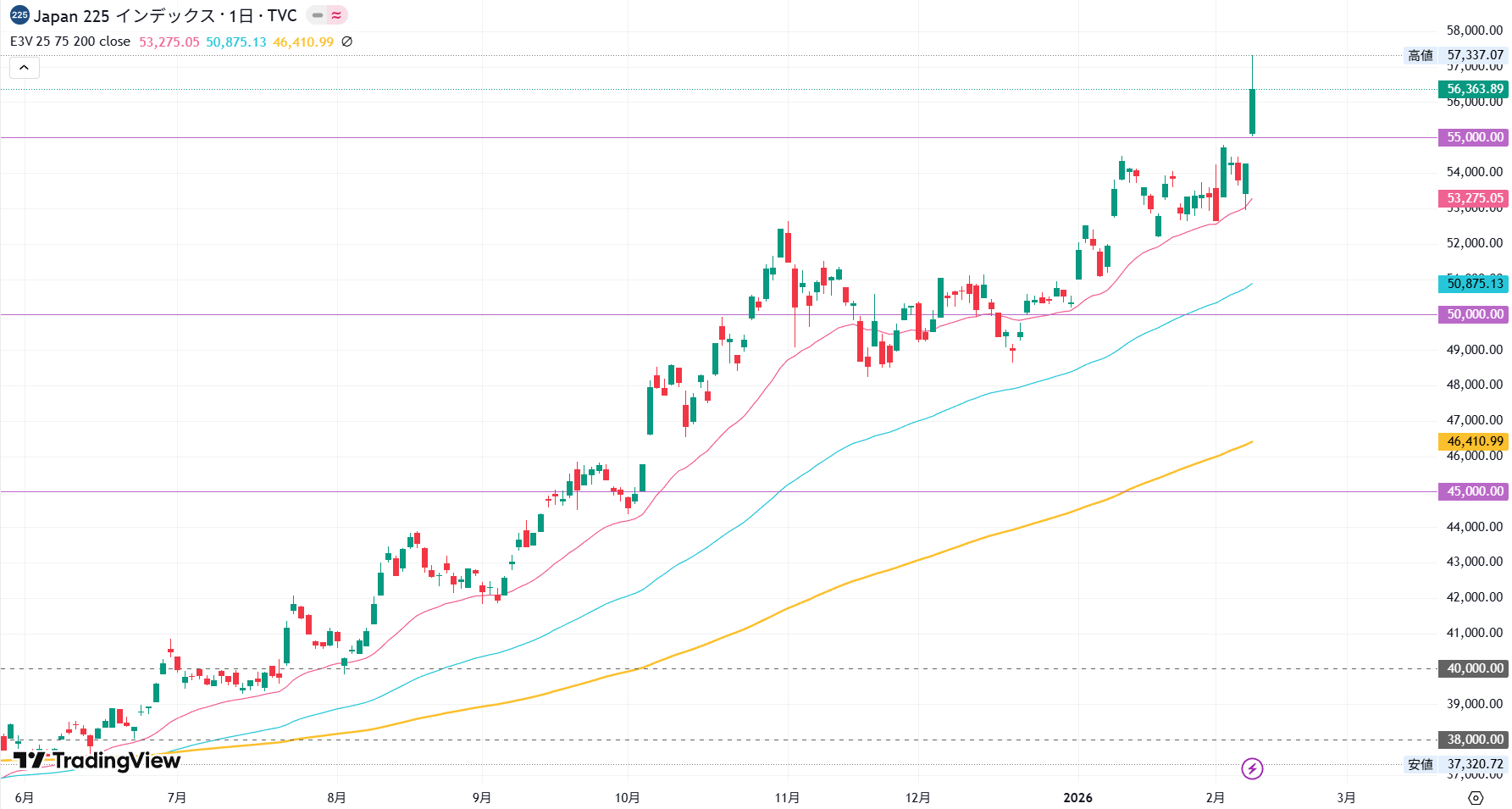 高市さんの歴史的圧勝を受けて、今日の日経平均は一時57,000円を超える超絶上昇に!!!